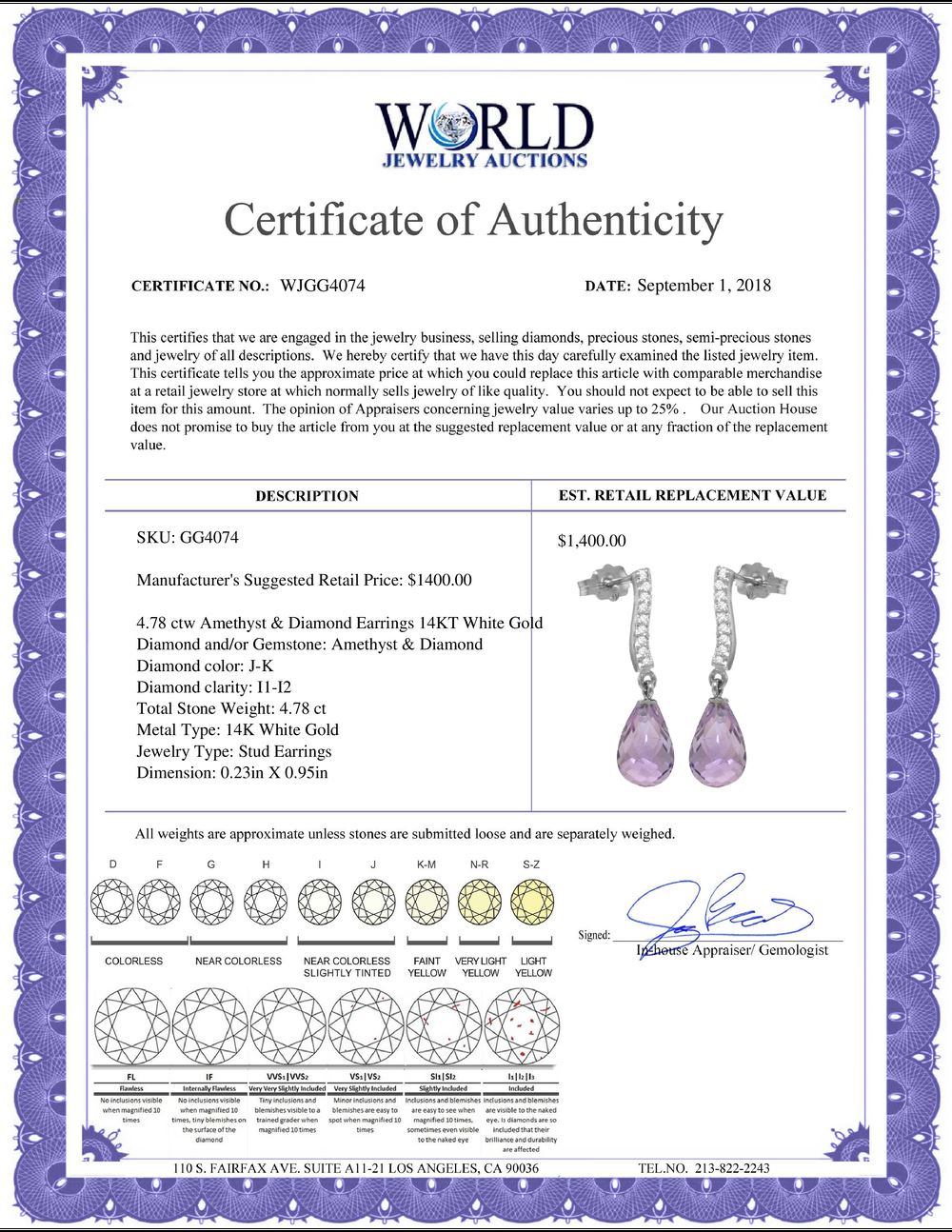 REF-46A2K - SKU: GG4074 ---- Genuine 4.78 ctw Amethyst & Diamond Earrings 14KT White Gold