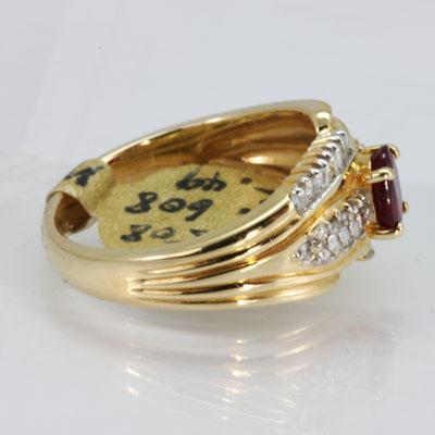 Gemstone: Ruby ; Gemstone Shape: Oval ; Gemstone Size: 5X4 ; Gemstone Weight: 4.49 ; Diamond Count: 16RD ; Diamond Weight: 0.29; Metal Purity: 14KT ; Metal: Yellow Gold ; Ring Size: 6.5