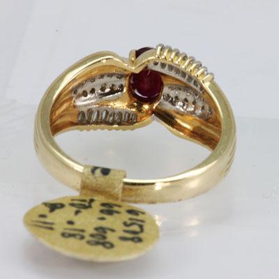 Gemstone: Ruby ; Gemstone Shape: Oval ; Gemstone Size: 5X4 ; Gemstone Weight: 4.49 ; Diamond Count: 16RD ; Diamond Weight: 0.29; Metal Purity: 14KT ; Metal: Yellow Gold ; Ring Size: 6.5