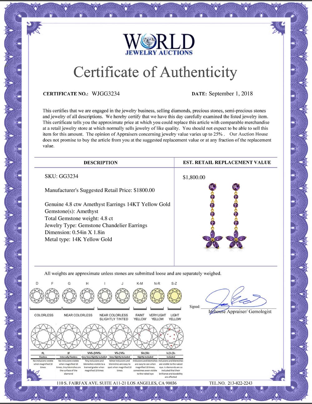 Genuine 14K Yellow Gold 4.8 ctw Amethyst Earrings