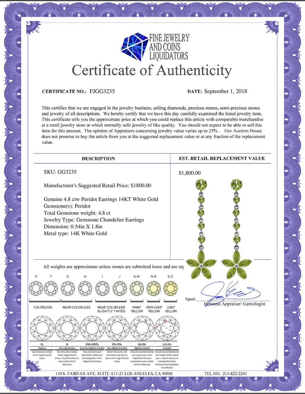 Genuine 14K White Gold 4.8 ctw Peridot Earrings