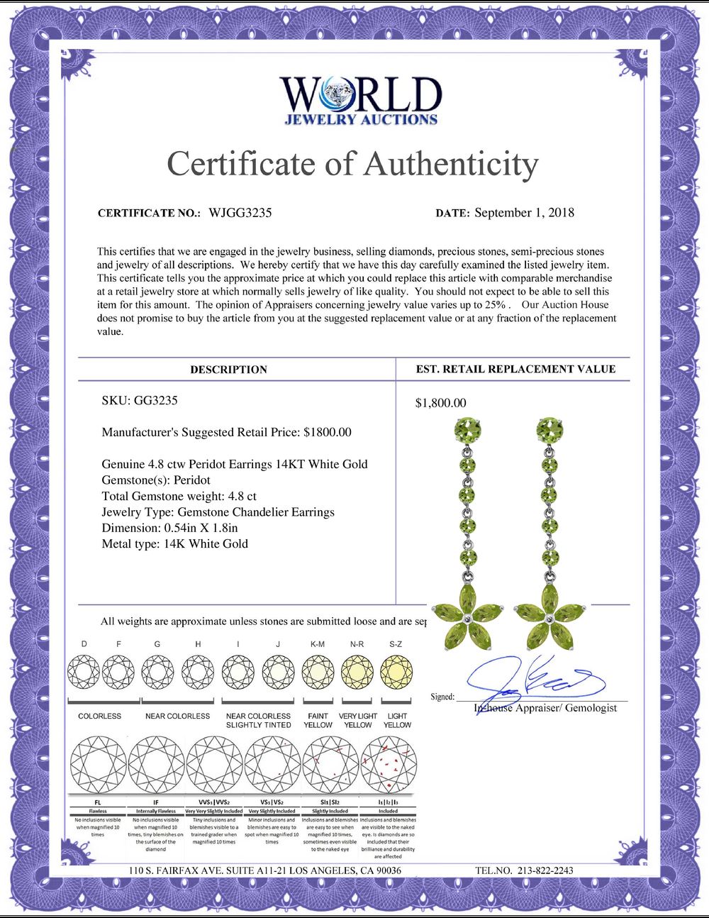 All property is sold “AS IS”, and ALL SALES ARE FINAL. Property is open to thorough public inspection. It is the Bidder’s responsibility to determine condition, age, genuineness, value or any other determinative factor. WJA may attempt to describe the merchandise in advertising and on the Internet but makes no representations. In no event shall WORLD JEWELRY AUCTION be held responsible for having made or implied any warranty of merchantability or fitness for a particular purpose. Bidder shall be the sole judge of value.