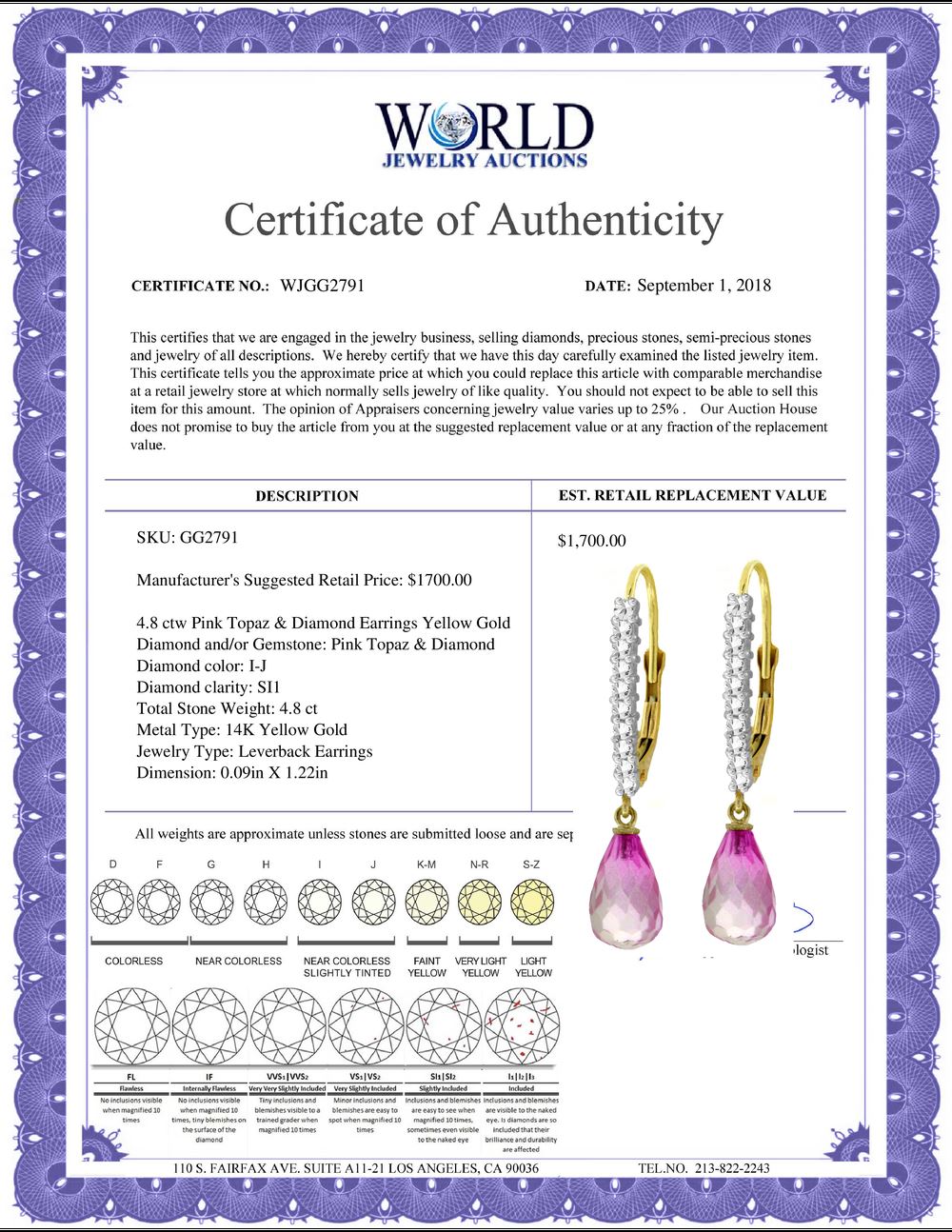 REF-54P5H - SKU: GG2791 ---- Genuine 4.8 ctw Pink Topaz & Diamond Earrings 14KT Yellow Gold