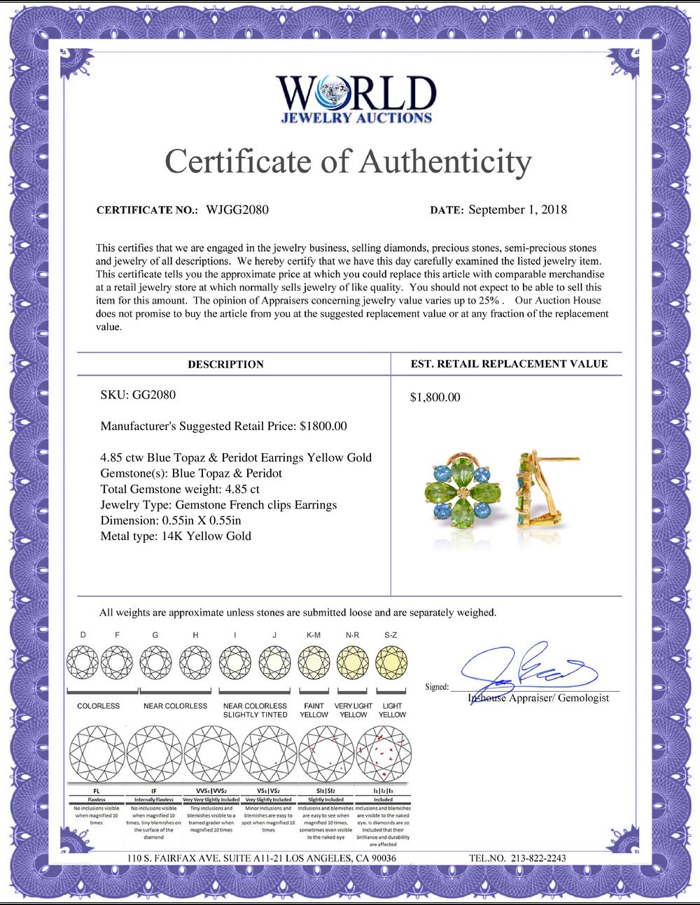 REF-58P4H - SKU: GG2080 ---- Genuine 4.85 ctw Blue Topaz & Peridot Earrings 14KT Yellow Gold