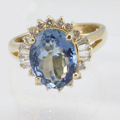 Diamond Weight: 0.32 ; Diamond Count 2: Tapered ; Diamond Weight 2: 0.22 ; Gemstone Weight: 4.39 ; Total Carat Weight: 4.93 ; Gemsotne: Tanzanite ; Metal Purity: 14KT ; Metal: Yellow Gold ; Ring Size: 7.5