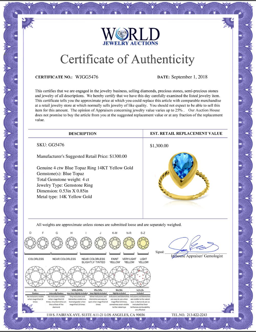 REF-42V6W - SKU: GG5476 ---- Genuine 4 ctw Blue Topaz Ring 14KT Yellow Gold