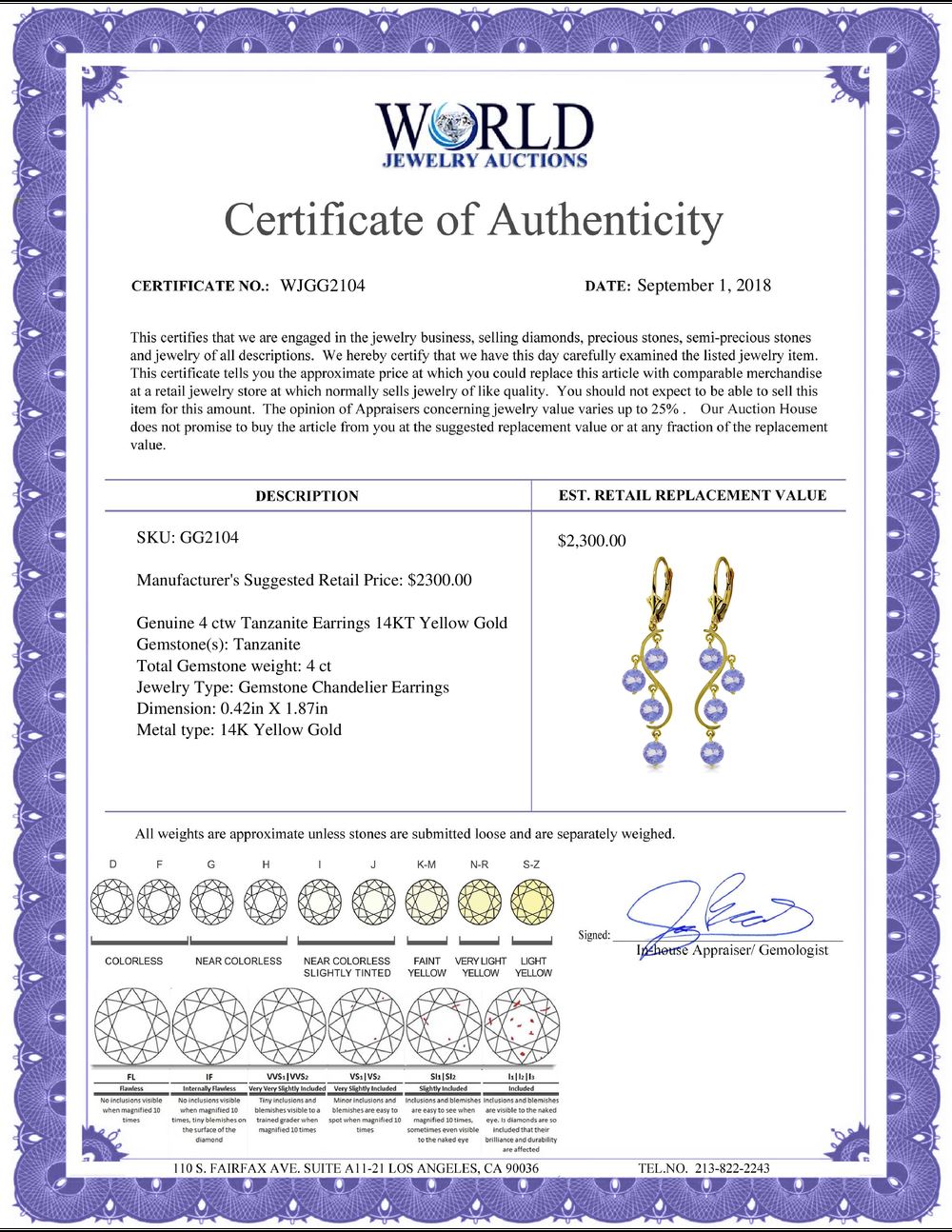 WORLD JEWELRY AUCTION believes to the best of its knowledge that the information presented in any listing has come from reliable sources. Such information is presented solely for the convenience of the Purchaser. WJA makes no warranties of any kind related to the information presented in any listing. WJA further makes no warranties, either express or implied, relating to the value, marketability or condition of the lot described in any listing. Prospective bidders should investigate a lot thoroughly before bidding. By bidding the Bidder acknowledges that Bidder has investigated the lot to his or her satisfaction, or, that Bidder has chosen not to do so, and agrees to accept the lot being bid on with no objections after the sale closes. If you are uncertain please contact us with your questions prior to bidding. If you are still uncertain after we reply, please refrain from bidding. Photos other graphic material contained in any listing of generic or duplicate lots may be stock presentations and not necessarily of the specific lot.
