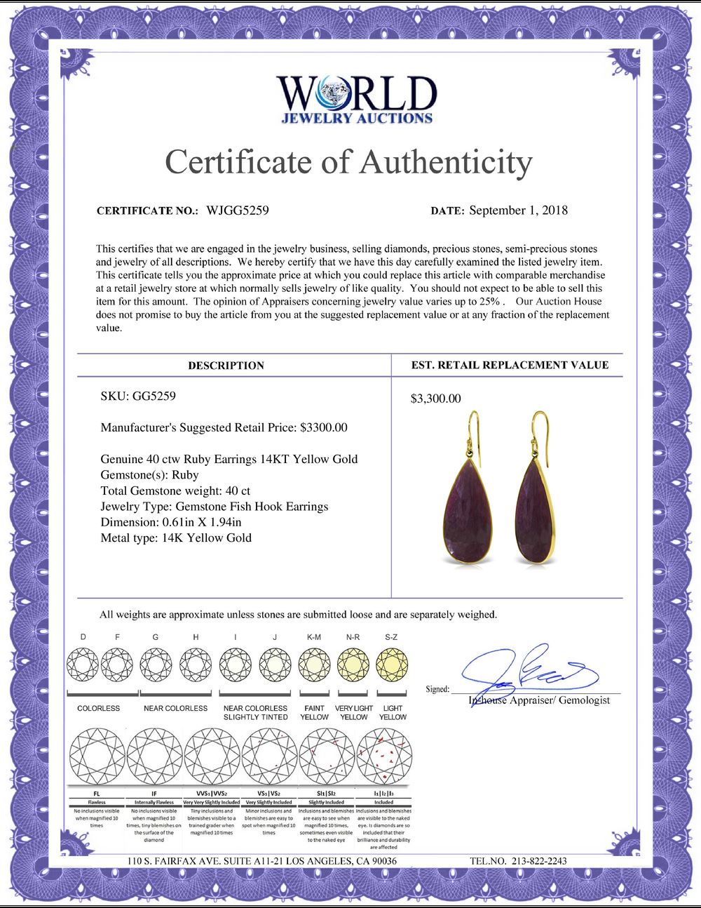 All property is sold “AS IS”, and ALL SALES ARE FINAL. Property is open to thorough public inspection. It is the Bidder’s responsibility to determine condition, age, genuineness, value or any other determinative factor. WJA may attempt to describe the merchandise in advertising and on the Internet but makes no representations. In no event shall WORLD JEWELRY AUCTION be held responsible for having made or implied any warranty of merchantability or fitness for a particular purpose. Bidder shall be the sole judge of value.
