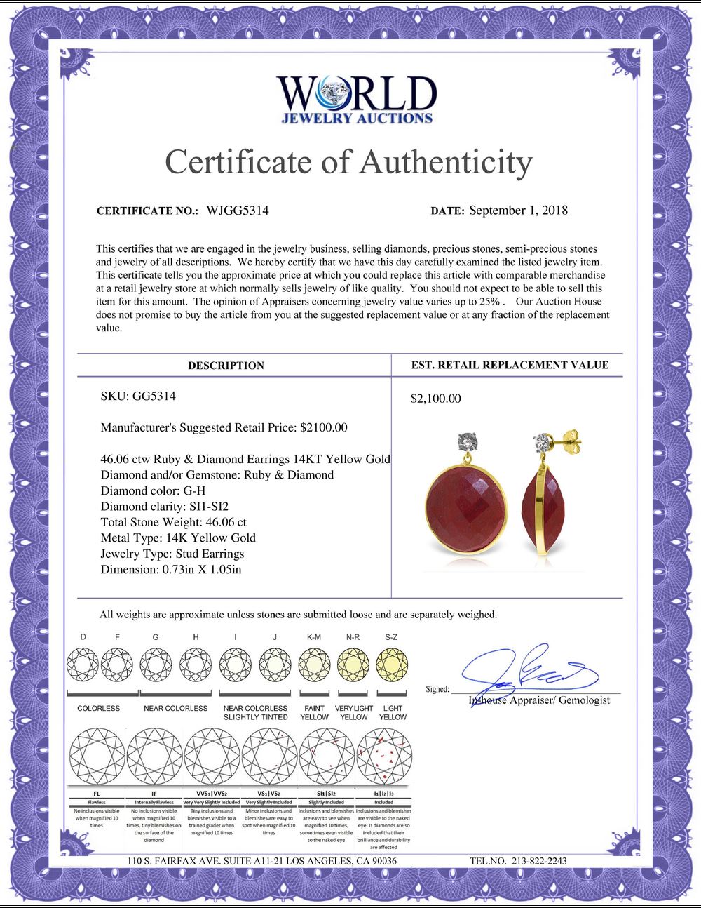 All property is sold “AS IS”, and ALL SALES ARE FINAL. Property is open to thorough public inspection. It is the Bidder’s responsibility to determine condition, age, genuineness, value or any other determinative factor. WJA may attempt to describe the merchandise in advertising and on the Internet but makes no representations. In no event shall WORLD JEWELRY AUCTION be held responsible for having made or implied any warranty of merchantability or fitness for a particular purpose. Bidder shall be the sole judge of value.