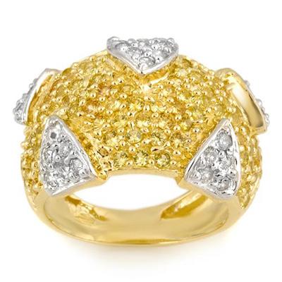 Diamond: 31 Round cut @ 1.0 ctw---- Clarity: SI-I---- Color: H-K----Gemstone: Natural Sapphire----Gemstone color: Yellow----Gemstone quality: Good-to-Very Good----Gemstone Cut & Weight: 90 Round cut @ 4.0 ctw----Metal Purity & Color : 14K Gold-Yellow----Gold weight: 12.9 grams----Ring size (US): 7.5----Dimension: Approx. 9/16 x 7/8----Consignor: World Jewelry Outlet----Delivery: Within 10 business days