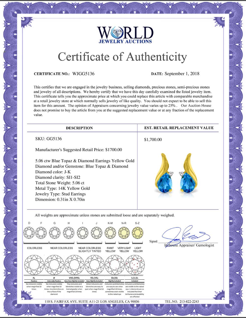 All property is sold “AS IS”, and ALL SALES ARE FINAL. Property is open to thorough public inspection. It is the Bidder’s responsibility to determine condition, age, genuineness, value or any other determinative factor. WJA may attempt to describe the merchandise in advertising and on the Internet but makes no representations. In no event shall WORLD JEWELRY AUCTION be held responsible for having made or implied any warranty of merchantability or fitness for a particular purpose. Bidder shall be the sole judge of value.