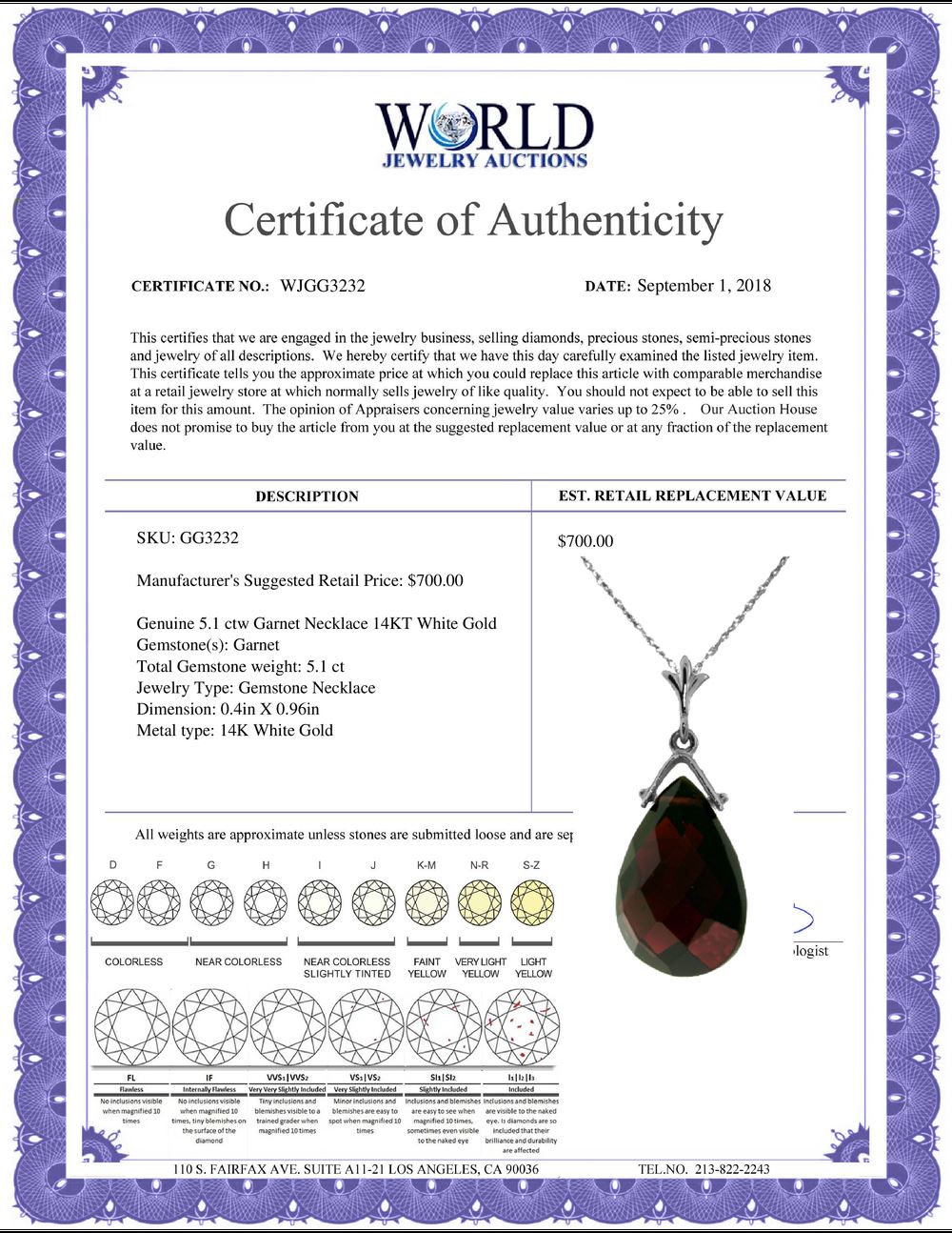 All property is sold “AS IS”, and ALL SALES ARE FINAL. Property is open to thorough public inspection. It is the Bidder’s responsibility to determine condition, age, genuineness, value or any other determinative factor. WJA may attempt to describe the merchandise in advertising and on the Internet but makes no representations. In no event shall WORLD JEWELRY AUCTION be held responsible for having made or implied any warranty of merchantability or fitness for a particular purpose. Bidder shall be the sole judge of value.