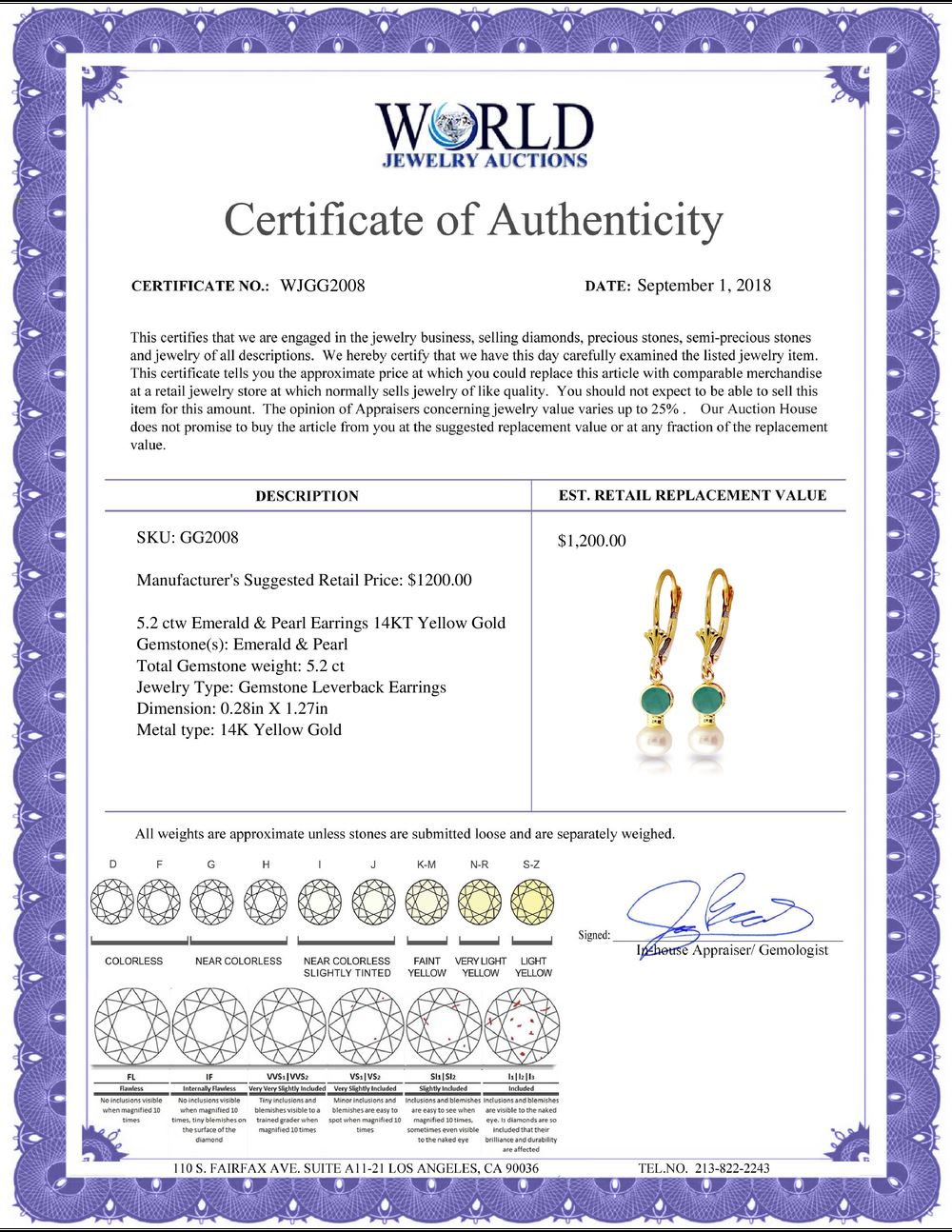 SKU: GG2008 ---- Genuine 5.2 ctw Emerald & Pearl Earrings 14KT Yellow Gold