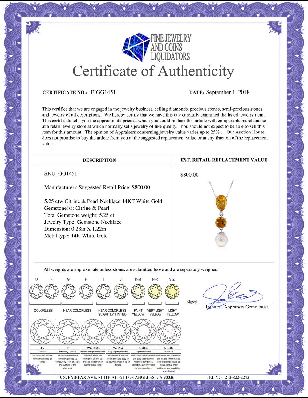 REF-25P9H - SKU: GG1451 ---- Genuine 5.25 ctw Citrine & Pearl Necklace 14KT White Gold