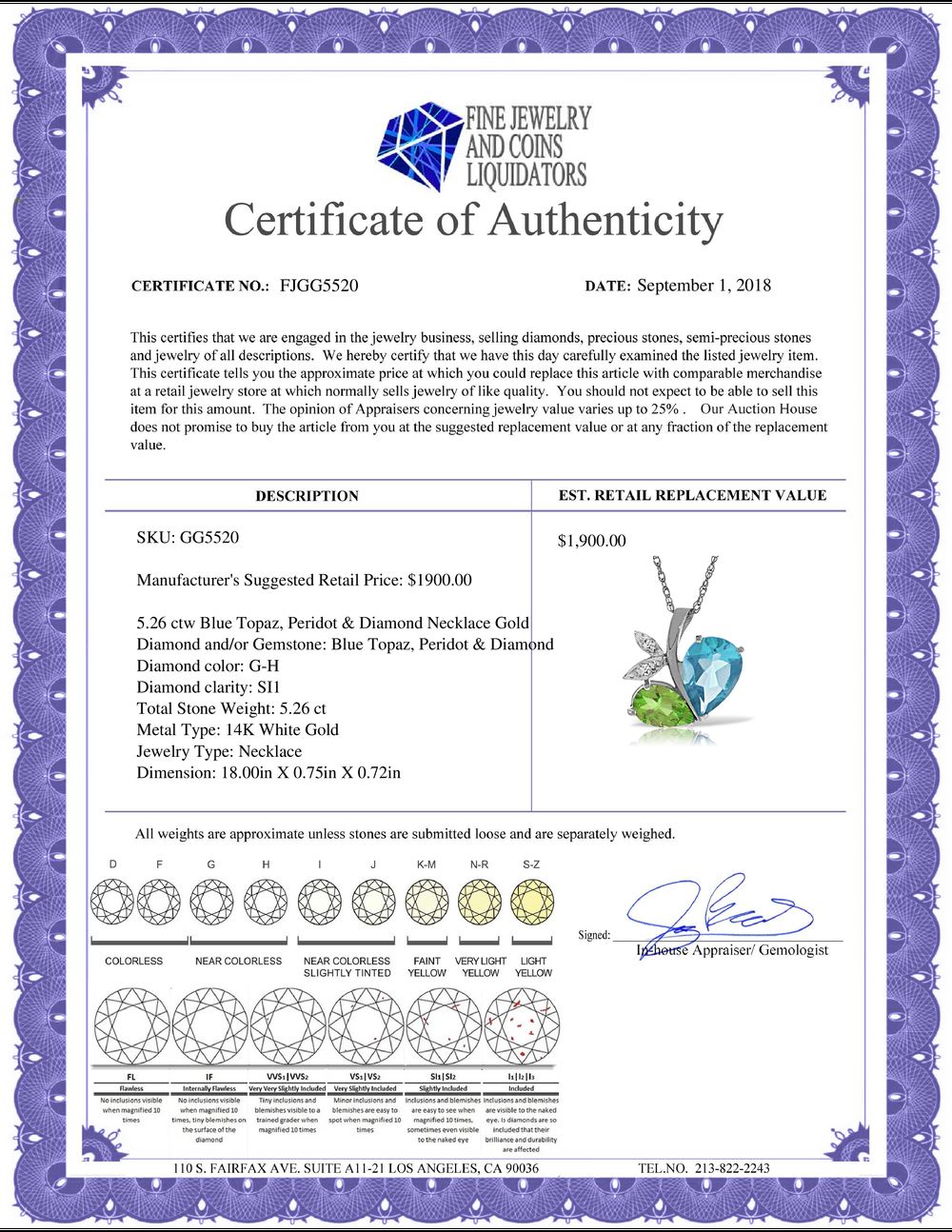 REF-60Y7F - SKU: GG5520 ---- Genuine 5.26 ctw Blue Topaz, Peridot & Diamond Necklace 14KT White Gold