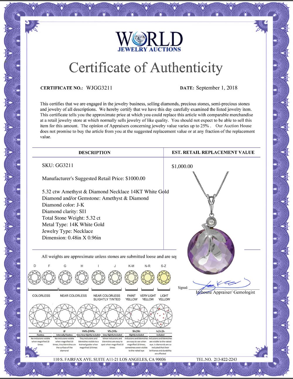 REF-31P2H - SKU: GG3211 ---- Genuine 5.32 ctw Amethyst & Diamond Necklace 14KT White Gold