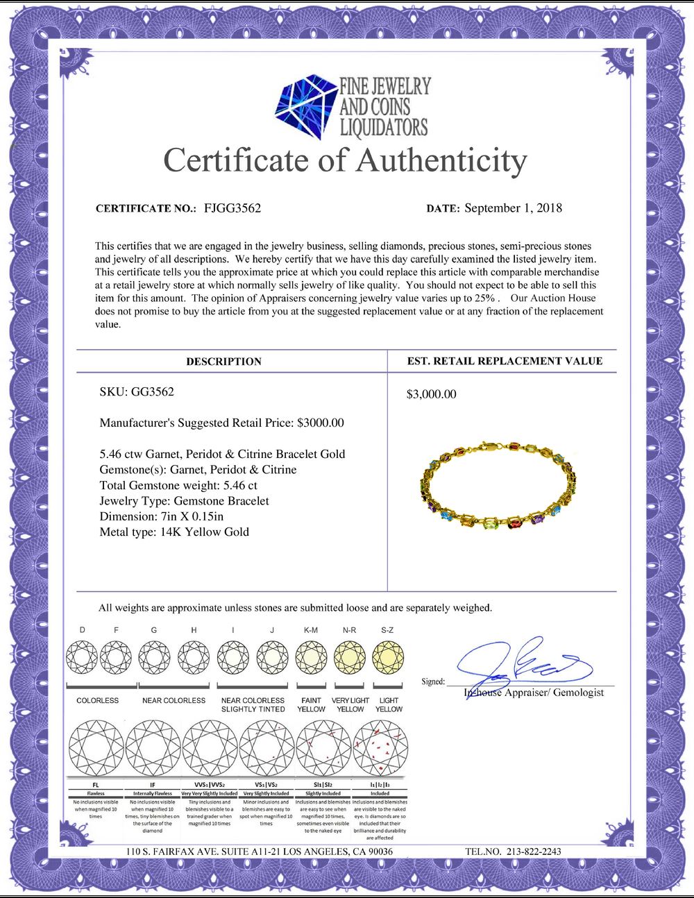 REF-96R7P - SKU: GG3562 ---- Genuine 5.46 ctw Garnet, Peridot & Citrine Bracelet 14KT Yellow Gold