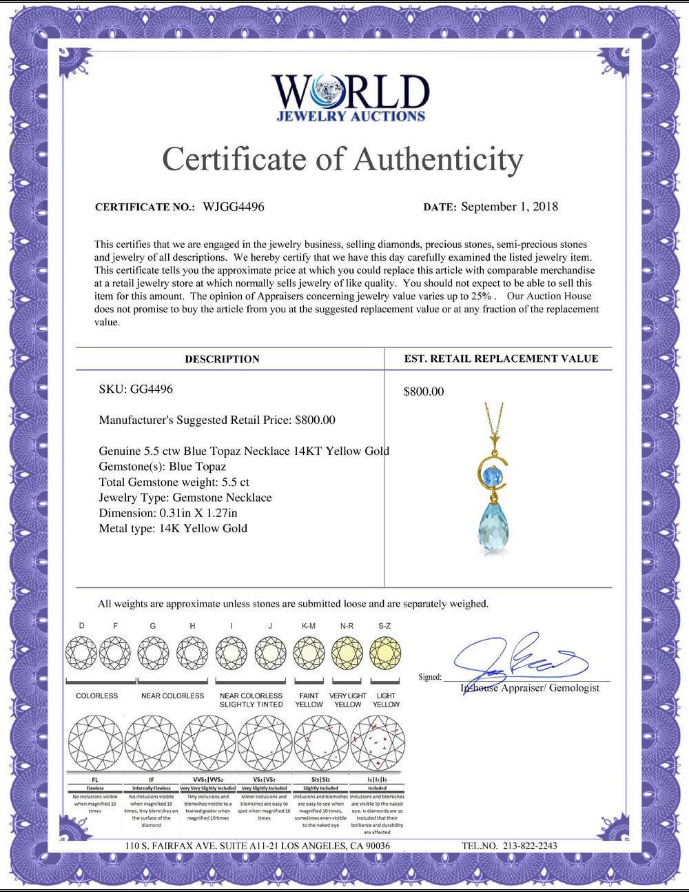 REF-25N6R - SKU: GG4496 ---- Genuine 5.5 ctw Blue Topaz Necklace 14KT Yellow Gold