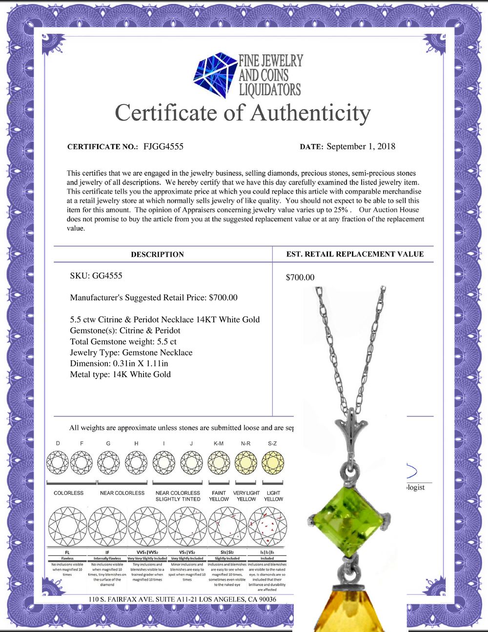 REF-22K2V - SKU: GG4555 ---- Genuine 5.5 ctw Citrine & Peridot Necklace 14KT White Gold