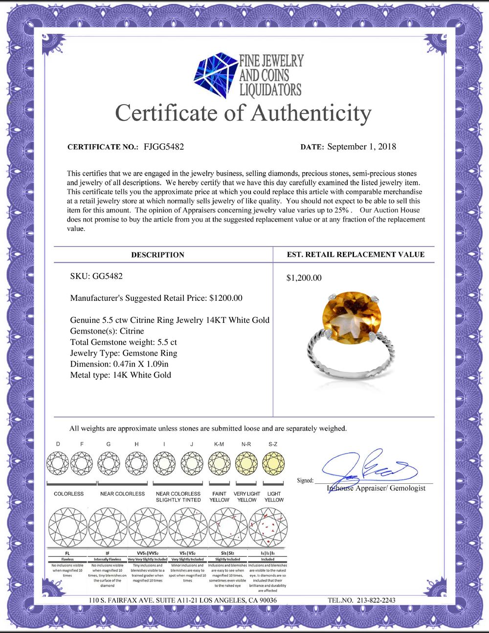 Genuine 14K White Gold 5.5 ctw Citrine Ring