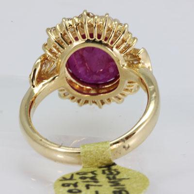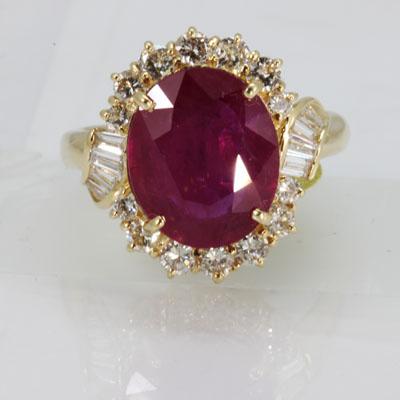 Gemstone: Ruby ; Gemstone Shape: Oval ; Gemstone Size: 12X10 ; Gemstone Weight: 4.89 ; Diamond Count: 14RD ; Diamond Weight: 0.86; Metal Purity: 14KT ; Metal: Yellow Gold ; Ring Size: 6.5