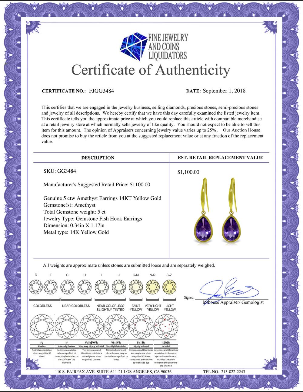REF-35W2Y - SKU: GG3484 ---- Genuine 5 ctw Amethyst Earrings 14KT Yellow Gold