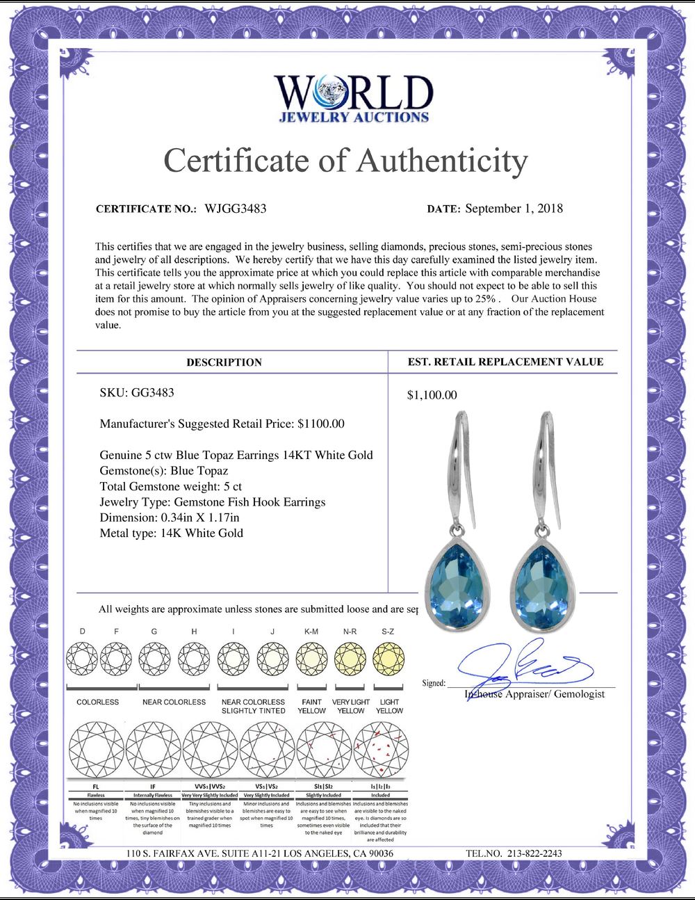 All property is sold “AS IS”, and ALL SALES ARE FINAL. Property is open to thorough public inspection. It is the Bidder’s responsibility to determine condition, age, genuineness, value or any other determinative factor. WJA may attempt to describe the merchandise in advertising and on the Internet but makes no representations. In no event shall WORLD JEWELRY AUCTION be held responsible for having made or implied any warranty of merchantability or fitness for a particular purpose. Bidder shall be the sole judge of value.