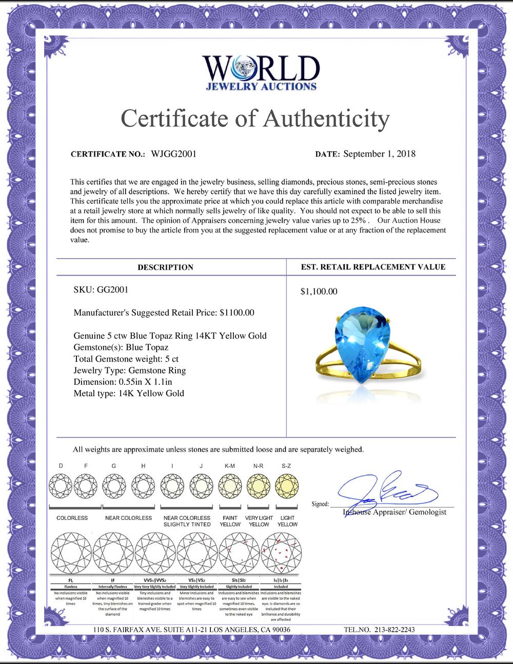 REF-34V3W - SKU: GG2001 ---- Genuine 5 ctw Blue Topaz Ring 14KT Yellow Gold