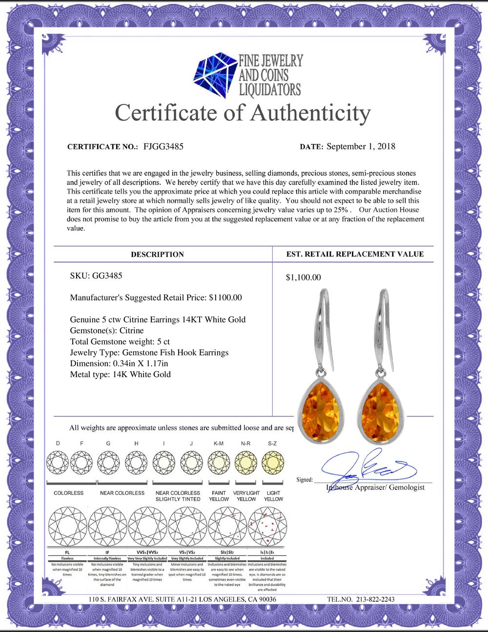 REF-35Y2F - SKU: GG3485 ---- Genuine 5 ctw Citrine Earrings 14KT White Gold