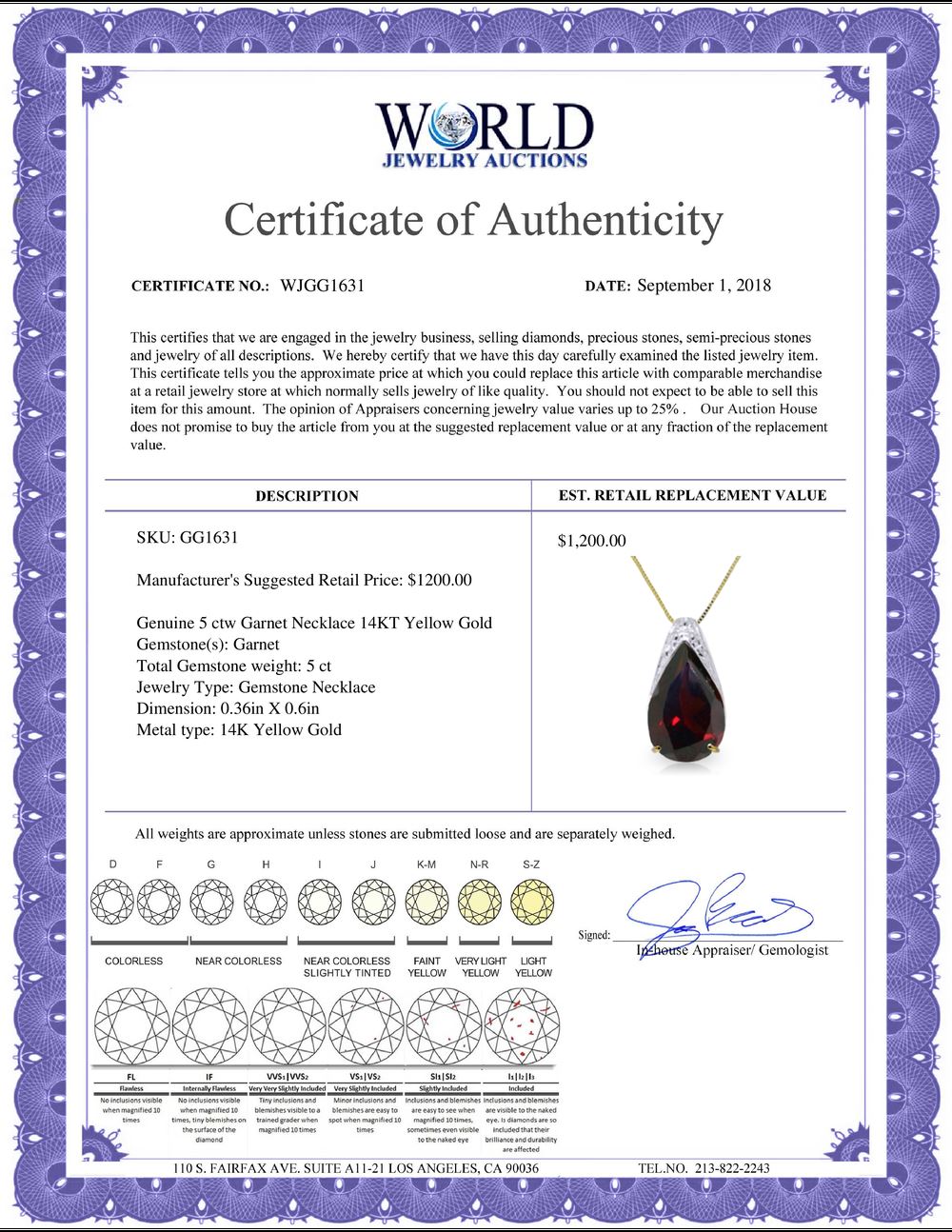 All property is sold “AS IS”, and ALL SALES ARE FINAL. Property is open to thorough public inspection. It is the Bidder’s responsibility to determine condition, age, genuineness, value or any other determinative factor. WJA may attempt to describe the merchandise in advertising and on the Internet but makes no representations. In no event shall WORLD JEWELRY AUCTION be held responsible for having made or implied any warranty of merchantability or fitness for a particular purpose. Bidder shall be the sole judge of value.