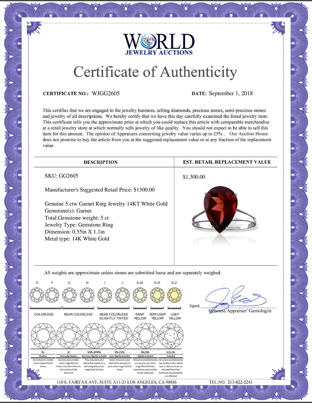 WORLD JEWELRY AUCTION believes to the best of its knowledge that the information presented in any listing has come from reliable sources. Such information is presented solely for the convenience of the Purchaser. WJA makes no warranties of any kind related to the information presented in any listing. WJA further makes no warranties, either express or implied, relating to the value, marketability or condition of the lot described in any listing. Prospective bidders should investigate a lot thoroughly before bidding. By bidding the Bidder acknowledges that Bidder has investigated the lot to his or her satisfaction, or, that Bidder has chosen not to do so, and agrees to accept the lot being bid on with no objections after the sale closes. If you are uncertain please contact us with your questions prior to bidding. If you are still uncertain after we reply, please refrain from bidding. Photos other graphic material contained in any listing of generic or duplicate lots may be stock presentations and not necessarily of the specific lot.