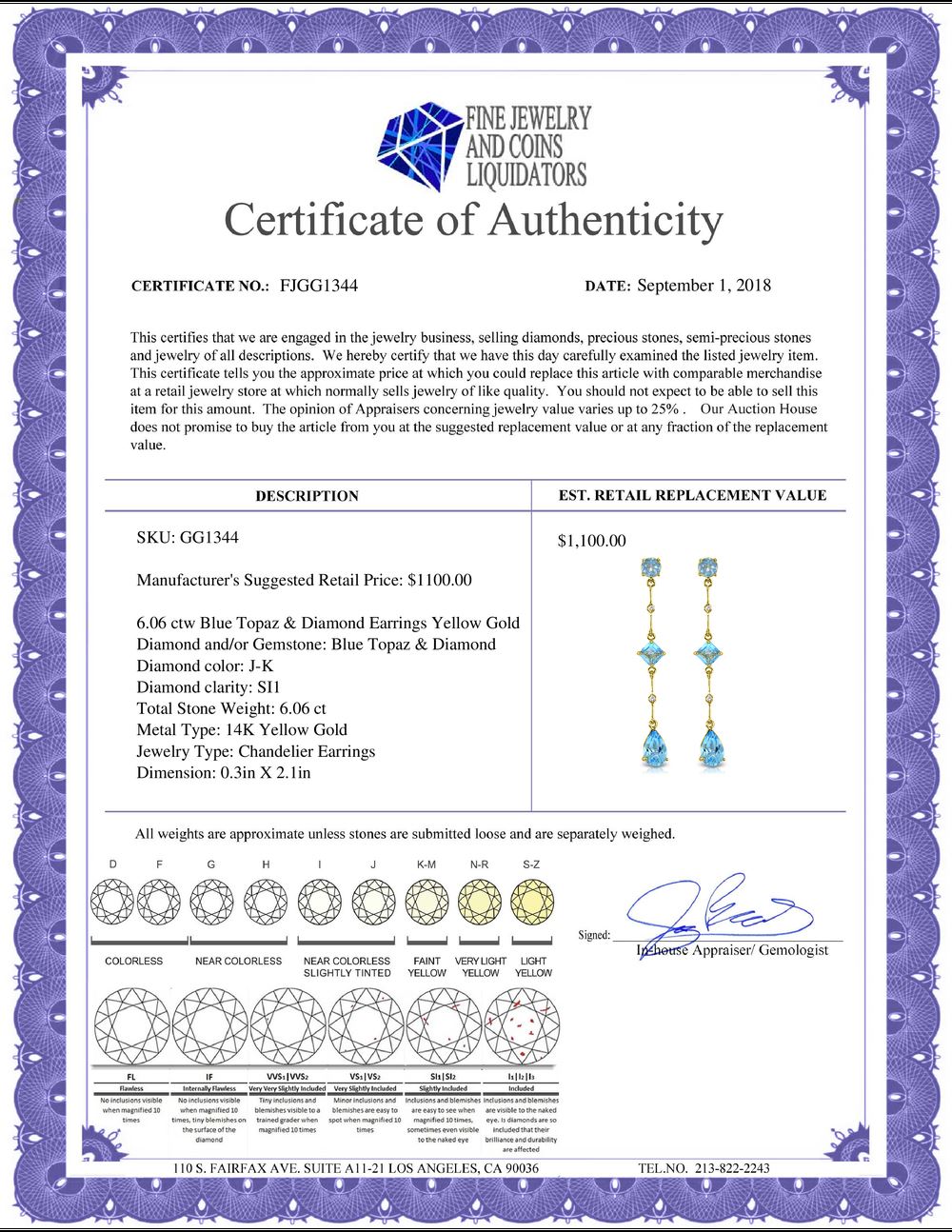 REF-33M8T - SKU: GG1344 ---- Genuine 6.06 ctw Blue Topaz & Diamond Earrings 14KT Yellow Gold