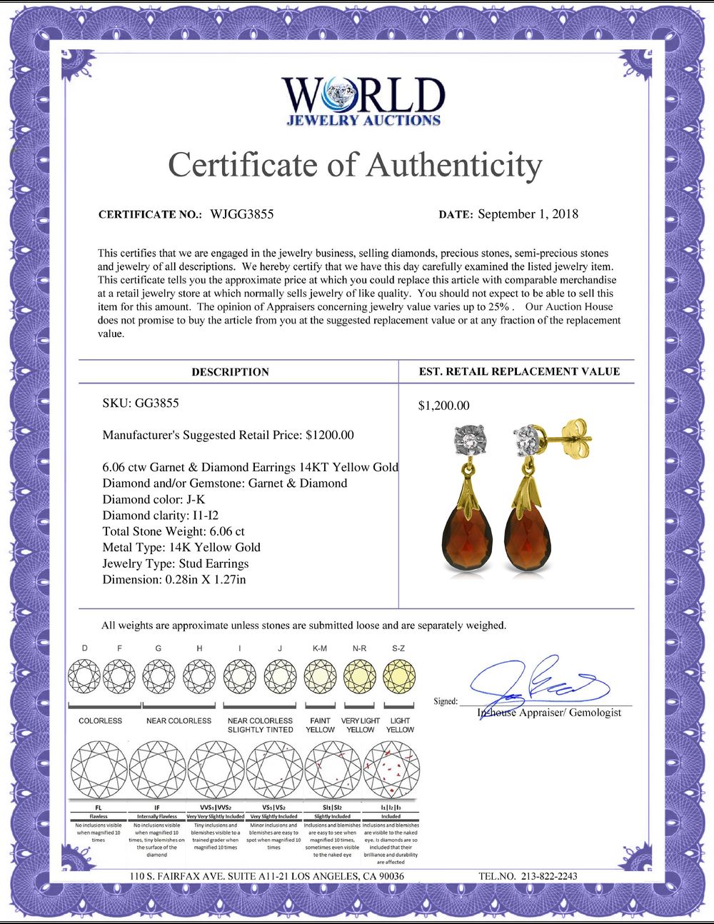 All property is sold “AS IS”, and ALL SALES ARE FINAL. Property is open to thorough public inspection. It is the Bidder’s responsibility to determine condition, age, genuineness, value or any other determinative factor. WJA may attempt to describe the merchandise in advertising and on the Internet but makes no representations. In no event shall WORLD JEWELRY AUCTION be held responsible for having made or implied any warranty of merchantability or fitness for a particular purpose. Bidder shall be the sole judge of value.