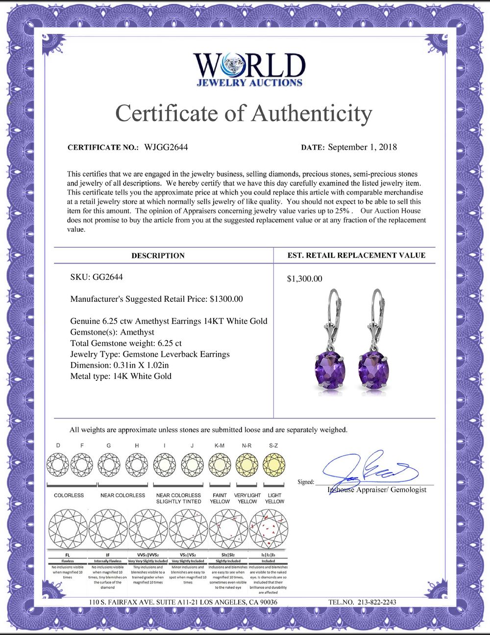All property is sold “AS IS”, and ALL SALES ARE FINAL. Property is open to thorough public inspection. It is the Bidder’s responsibility to determine condition, age, genuineness, value or any other determinative factor. WJA may attempt to describe the merchandise in advertising and on the Internet but makes no representations. In no event shall WORLD JEWELRY AUCTION be held responsible for having made or implied any warranty of merchantability or fitness for a particular purpose. Bidder shall be the sole judge of value.