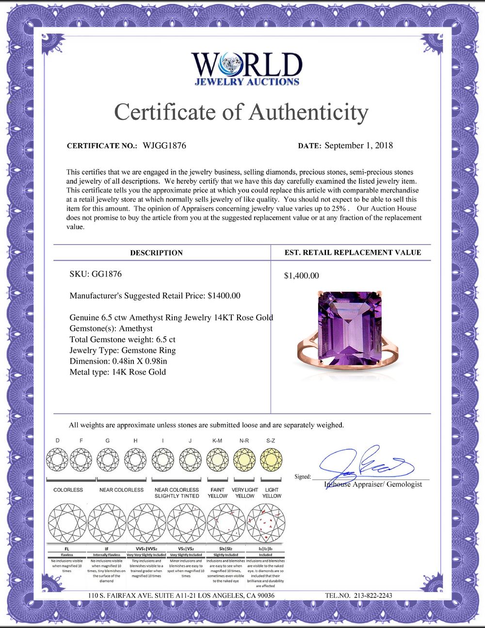 All property is sold “AS IS”, and ALL SALES ARE FINAL. Property is open to thorough public inspection. It is the Bidder’s responsibility to determine condition, age, genuineness, value or any other determinative factor. WJA may attempt to describe the merchandise in advertising and on the Internet but makes no representations. In no event shall WORLD JEWELRY AUCTION be held responsible for having made or implied any warranty of merchantability or fitness for a particular purpose. Bidder shall be the sole judge of value.