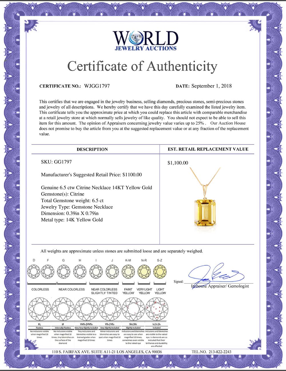 All property is sold “AS IS”, and ALL SALES ARE FINAL. Property is open to thorough public inspection. It is the Bidder’s responsibility to determine condition, age, genuineness, value or any other determinative factor. WJA may attempt to describe the merchandise in advertising and on the Internet but makes no representations. In no event shall WORLD JEWELRY AUCTION be held responsible for having made or implied any warranty of merchantability or fitness for a particular purpose. Bidder shall be the sole judge of value.