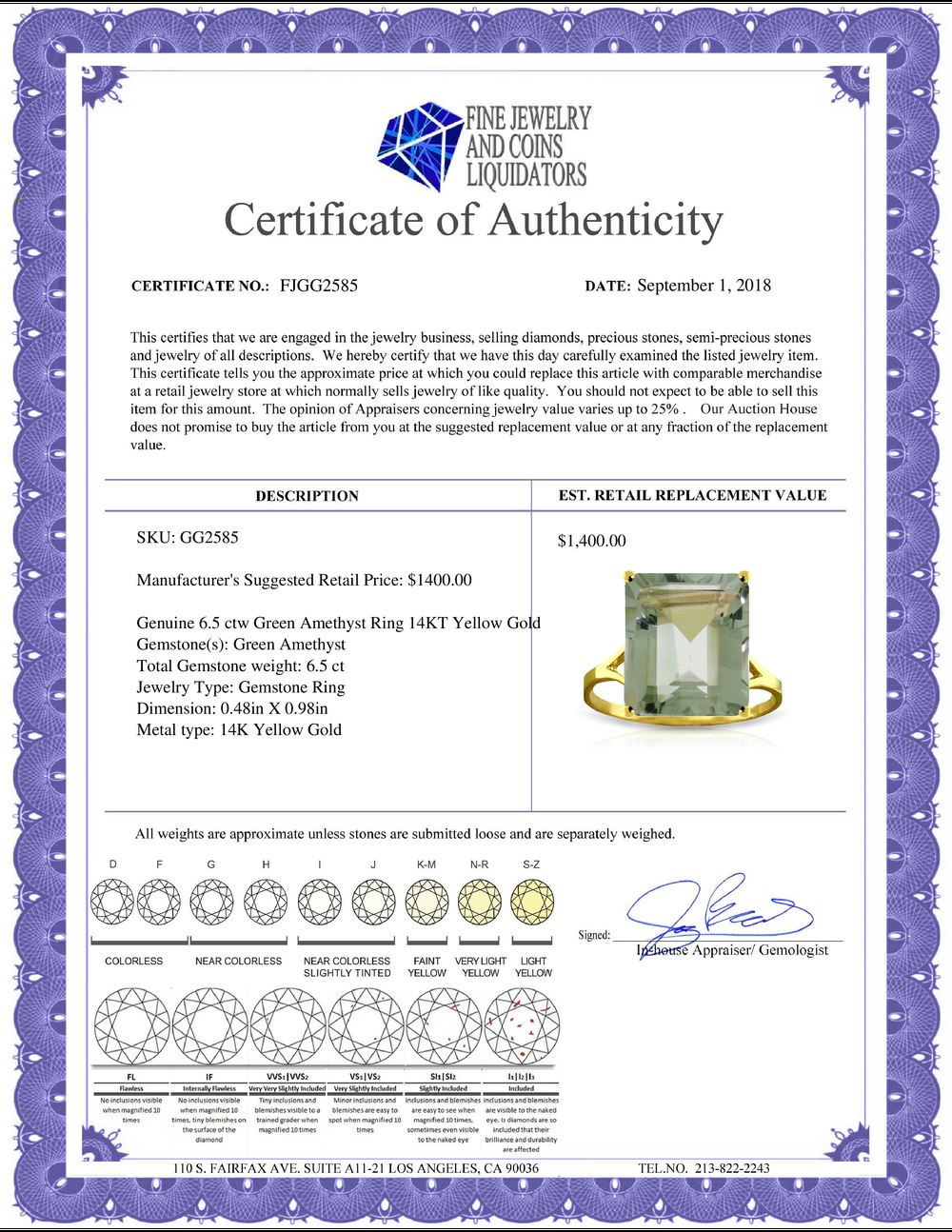 REF-43N8R - SKU: GG2585 ---- Genuine 6.5 ctw Green Amethyst Ring 14KT Yellow Gold