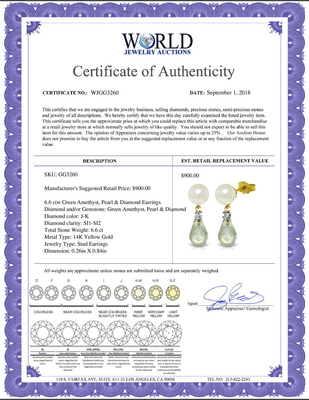 Genuine 14K Yellow Gold 6.6 ctw Green Amethyst, Pearl & Diamond Earrings