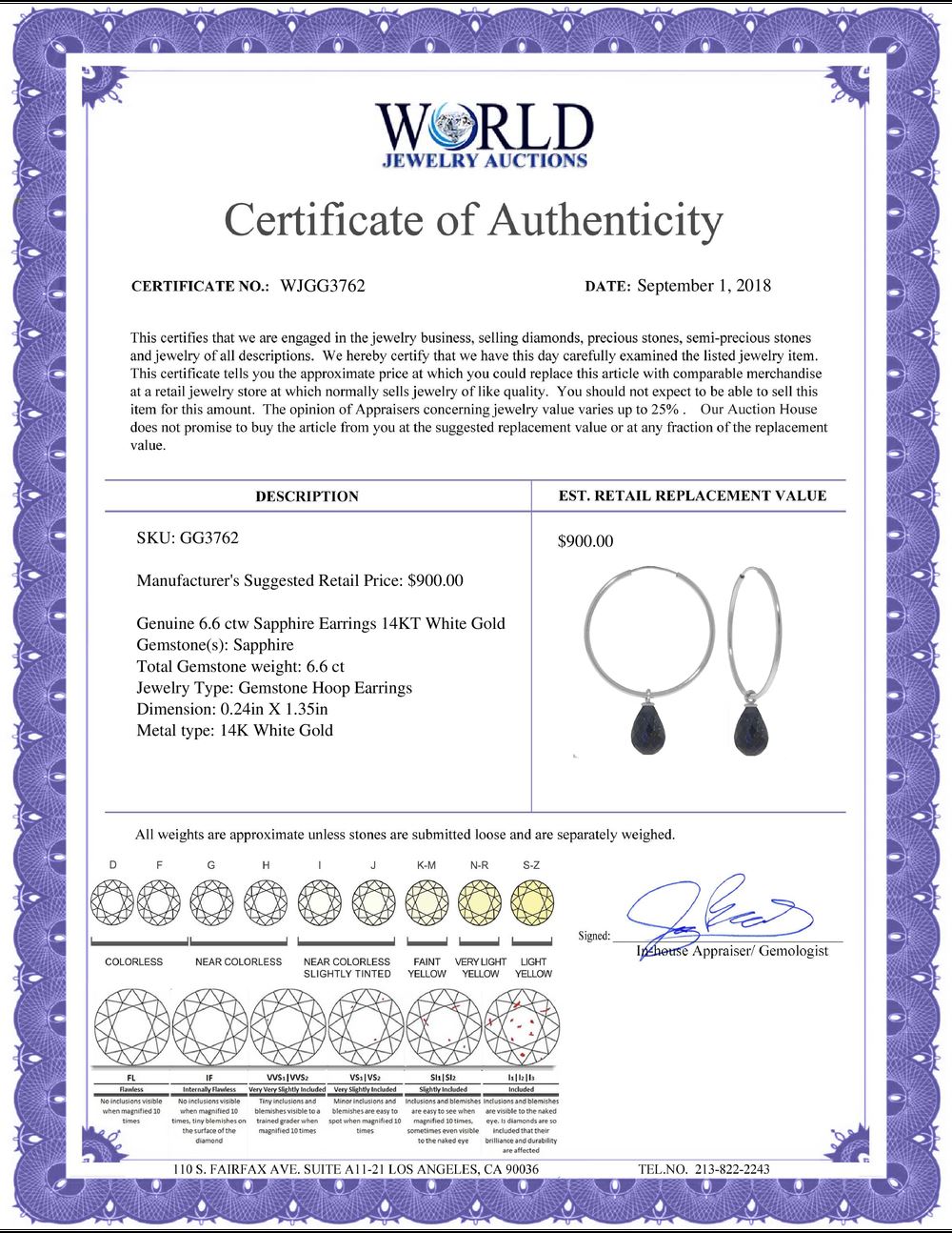 All property is sold “AS IS”, and ALL SALES ARE FINAL. Property is open to thorough public inspection. It is the Bidder’s responsibility to determine condition, age, genuineness, value or any other determinative factor. WJA may attempt to describe the merchandise in advertising and on the Internet but makes no representations. In no event shall WORLD JEWELRY AUCTION be held responsible for having made or implied any warranty of merchantability or fitness for a particular purpose. Bidder shall be the sole judge of value.