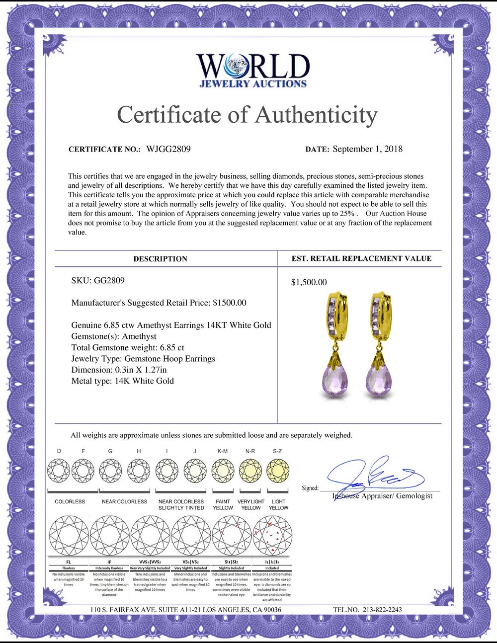 All property is sold “AS IS”, and ALL SALES ARE FINAL. Property is open to thorough public inspection. It is the Bidder’s responsibility to determine condition, age, genuineness, value or any other determinative factor. WJA may attempt to describe the merchandise in advertising and on the Internet but makes no representations. In no event shall WORLD JEWELRY AUCTION be held responsible for having made or implied any warranty of merchantability or fitness for a particular purpose. Bidder shall be the sole judge of value.