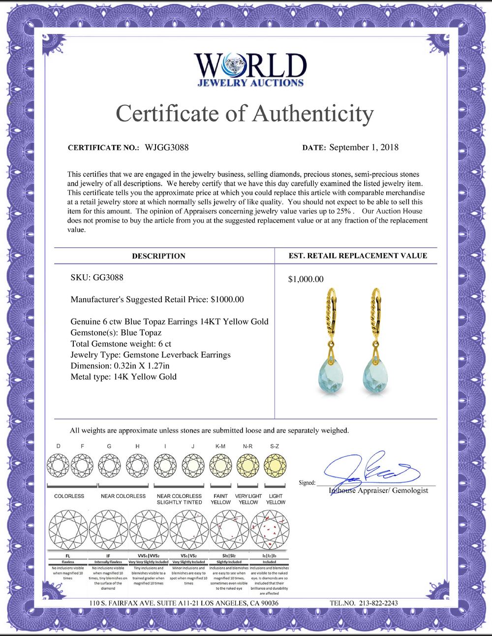 Genuine 14K Yellow Gold 6 ctw Blue Topaz Earrings