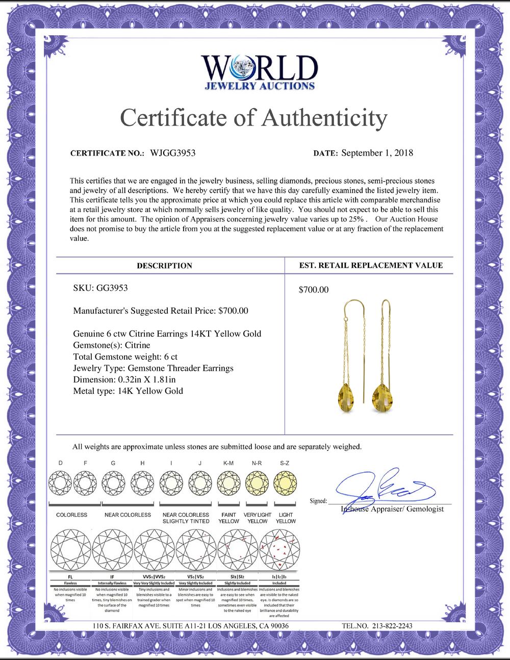 REF-21M9T - SKU: GG3953 ---- Genuine 6 ctw Citrine Earrings 14KT Yellow Gold