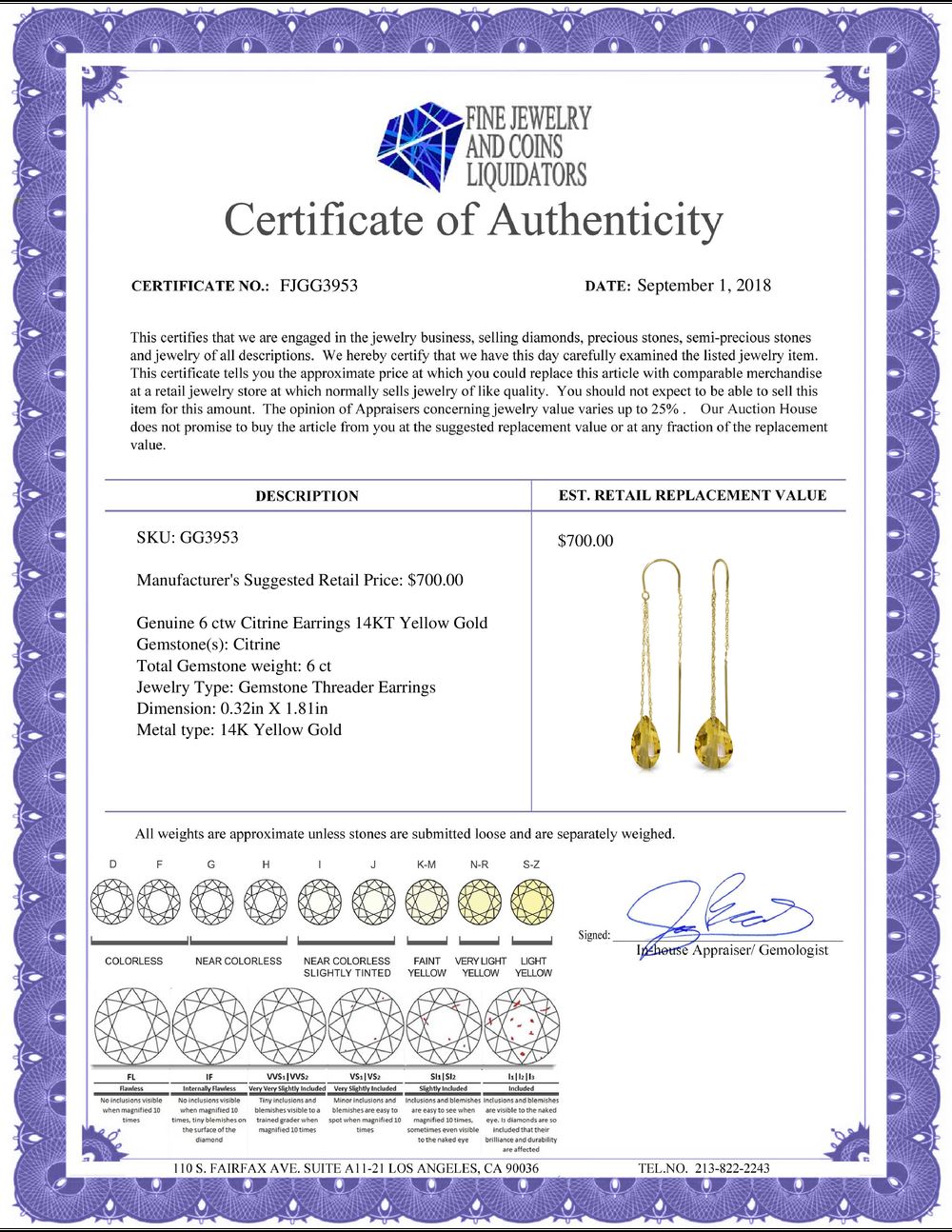 REF-21M9T - SKU: GG3953 ---- Genuine 6 ctw Citrine Earrings 14KT Yellow Gold