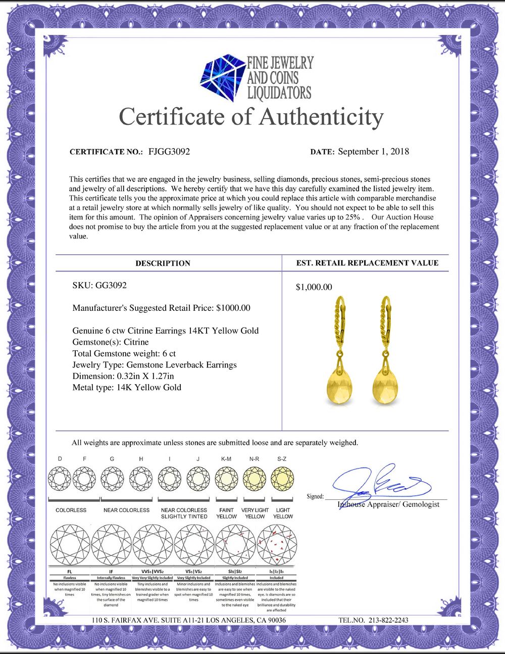 Genuine 14K Yellow Gold 6 ctw Citrine Earrings