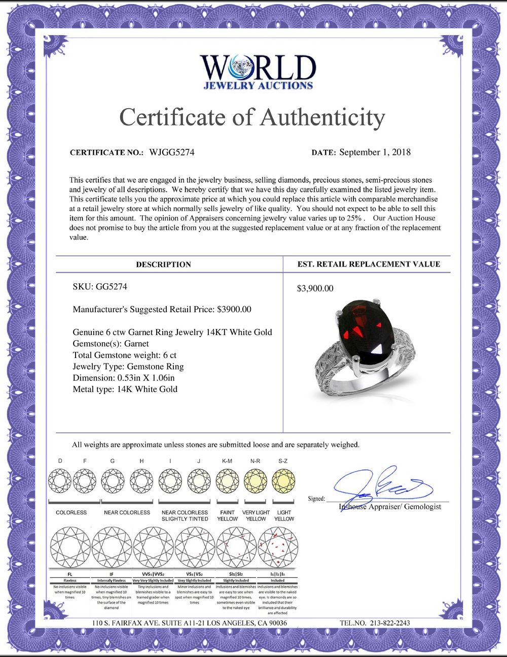 REF-129K6V - SKU: GG5274 ---- Genuine 6 ctw Garnet Ring 14KT White Gold