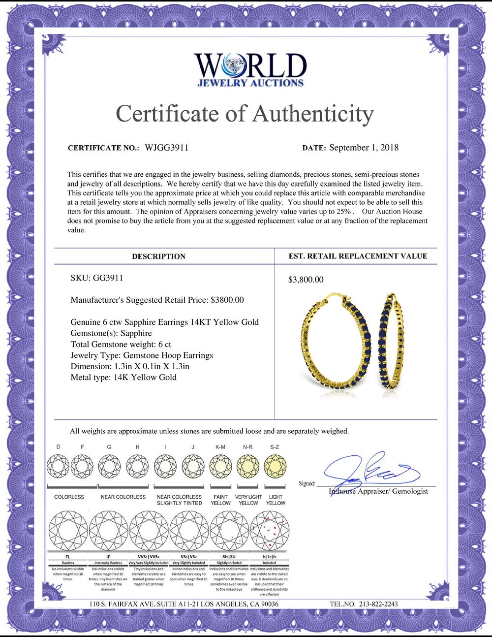 All property is sold “AS IS”, and ALL SALES ARE FINAL. Property is open to thorough public inspection. It is the Bidder’s responsibility to determine condition, age, genuineness, value or any other determinative factor. WJA may attempt to describe the merchandise in advertising and on the Internet but makes no representations. In no event shall WORLD JEWELRY AUCTION be held responsible for having made or implied any warranty of merchantability or fitness for a particular purpose. Bidder shall be the sole judge of value.