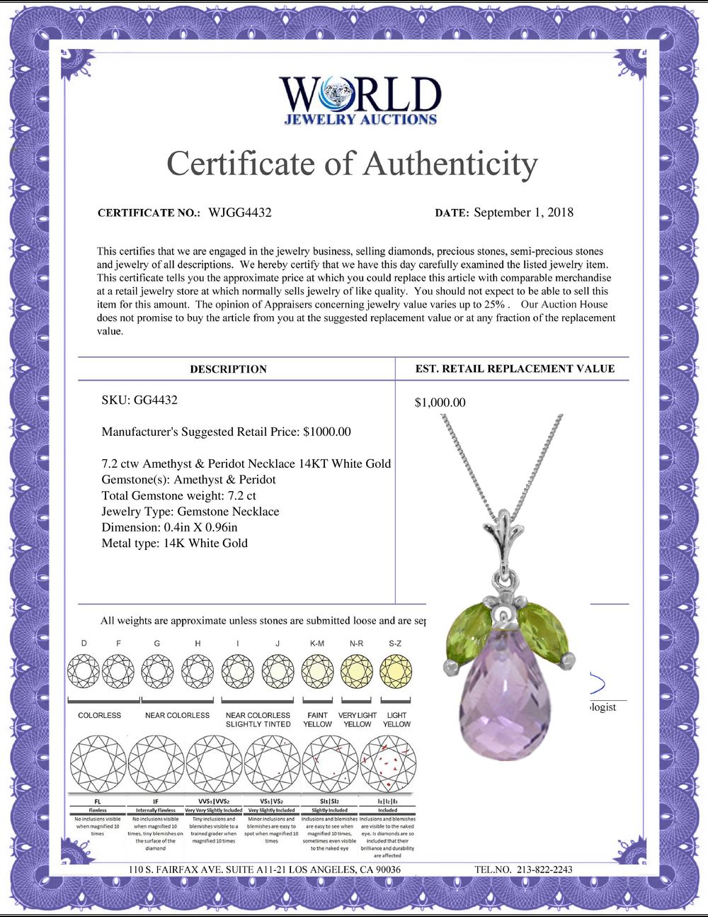 All property is sold “AS IS”, and ALL SALES ARE FINAL. Property is open to thorough public inspection. It is the Bidder’s responsibility to determine condition, age, genuineness, value or any other determinative factor. WJA may attempt to describe the merchandise in advertising and on the Internet but makes no representations. In no event shall WORLD JEWELRY AUCTION be held responsible for having made or implied any warranty of merchantability or fitness for a particular purpose. Bidder shall be the sole judge of value.