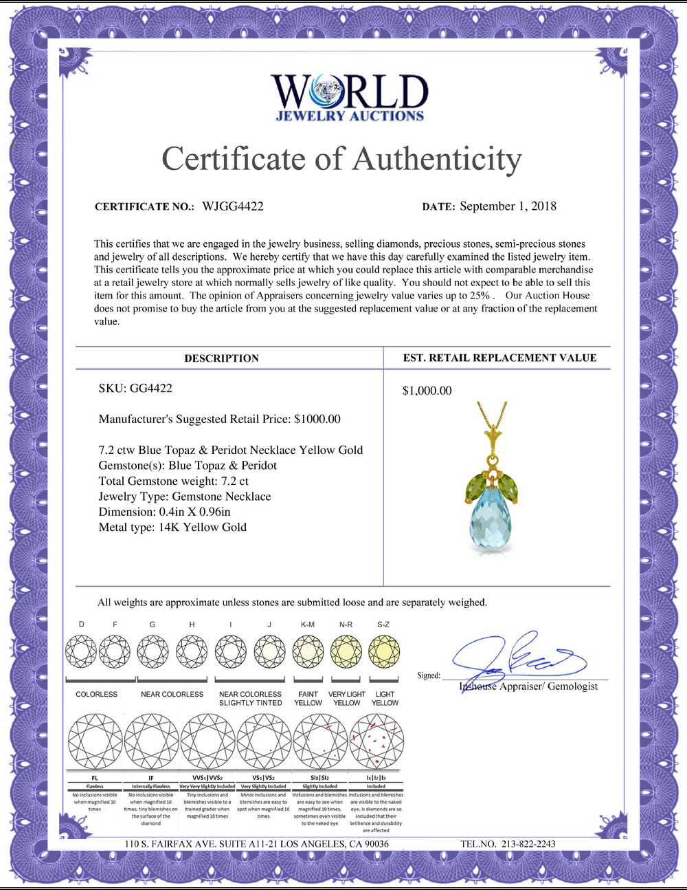REF-30P5H - SKU: GG4422 ---- Genuine 7.2 ctw Blue Topaz & Peridot Necklace 14KT Yellow Gold