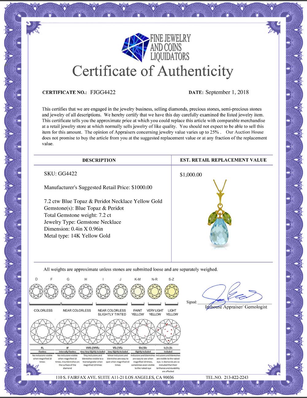 REF-30P5H - SKU: GG4422 ---- Genuine 7.2 ctw Blue Topaz & Peridot Necklace 14KT Yellow Gold