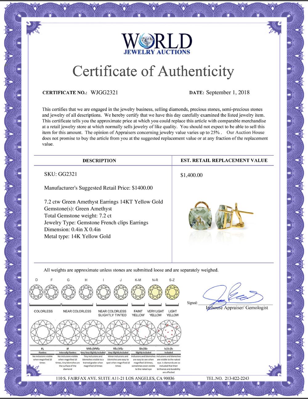 All property is sold “AS IS”, and ALL SALES ARE FINAL. Property is open to thorough public inspection. It is the Bidder’s responsibility to determine condition, age, genuineness, value or any other determinative factor. WJA may attempt to describe the merchandise in advertising and on the Internet but makes no representations. In no event shall WORLD JEWELRY AUCTION be held responsible for having made or implied any warranty of merchantability or fitness for a particular purpose. Bidder shall be the sole judge of value.